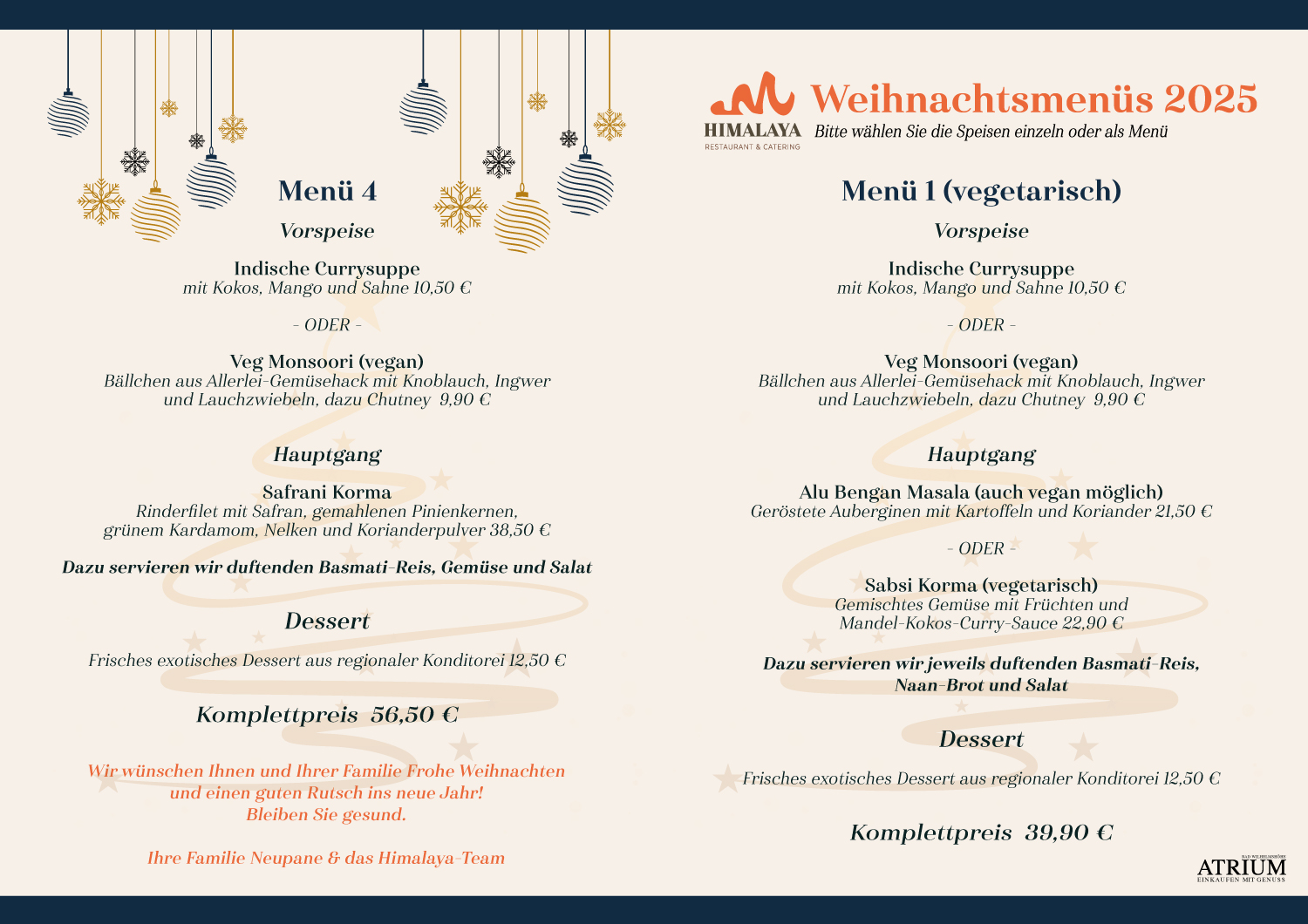 An den Feiertagen, dem 25. und 26. Dezember, sind wir von 12:00 bis 15:00 Uhr für Sie da. In dieser festlichen Mittagszeit erwartet Sie unser liebevoll zusammengestelltes Weihnachtsmenü – eine Auswahl besonderer Speisen, die den Zauber der Feiertage kulinarisch einfangen.