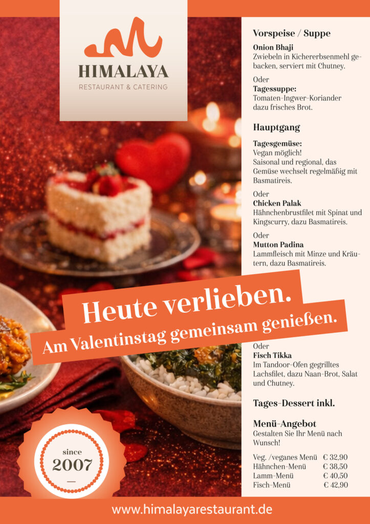 Am 14. Februar verwandelt sich das Himalaya Restaurant in einen Ort für Zweisamkeit, Geschmack und romantische Stimmung. Unser liebevoll zusammengestelltes Valentinsmenü bietet Ihnen eine Auswahl an köstlichen Speisen – ob vegan, vegetarisch oder mit Fleisch – und wird durch ein Tagesdessert abgerundet.✨